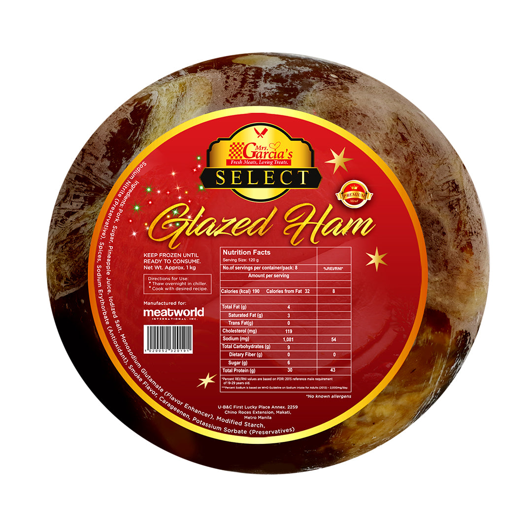 The Effortless Holiday Centrepiece for Any Occasion! Bring the warm, festive flavor of a traditional ham to your table with this convenient 1kg pack of Mrs. Garcia's Select Glazed Ham. Fully cooked and pre-glazed with a sweet, savory, and caramelized coating, this ham is ready to be quickly warmed and sliced. It provides a perfect balance of smoky richness and sweet glaze, making it the ideal centrepiece for holiday gatherings, special dinners, or elegant sandwiches.